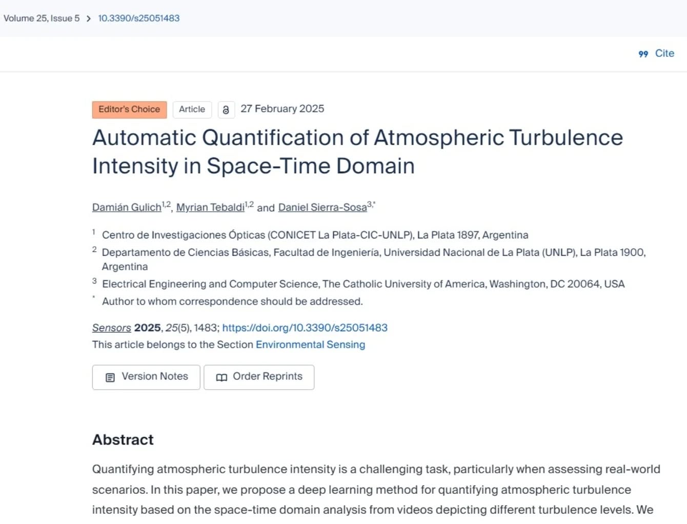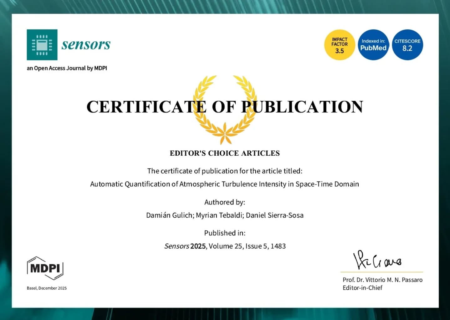 Este reconocimiento se otorga a artículos que los editores consideran especialmente relevantes, novedosos o de alto impacto potencial dentro de su área. En este caso, el trabajo explora una forma innovadora y de bajo costo para medir la intensidad de la turbulencia atmosférica a partir de videos y técnicas de aprendizaje profundo, un desafío clave para aplicaciones ópticas, tales como comunicaciones, imágenes a larga distancia y estudios atmosféricos.
